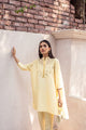 Infused with signature aesthetic, this cream coloured classic "malmal" is hand embroidered with sequin and black tukri work. The ensemble comes with embroidered Raw Silk pants adorned with motifs.