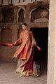 This sophisticated ivory A-line shirt features a guluband style neckline that beautifully frames the face. The shirt is adorned with exquisite reesham jaal work across the front, complemented by delicate reesham floral embroidery that adds dimension and depth. Inspired by the grandeur of Mughal kundan jewelry, the ensemble also includes touches of kundan work that elevate its regal appeal. Paired with a double-sided printed cotton net dupatta, showcasing the classic hiran jaal and adorned with shimmering sitara work, this ensemble is a timeless piece perfect for sophisticated wedding events or formal occasions.