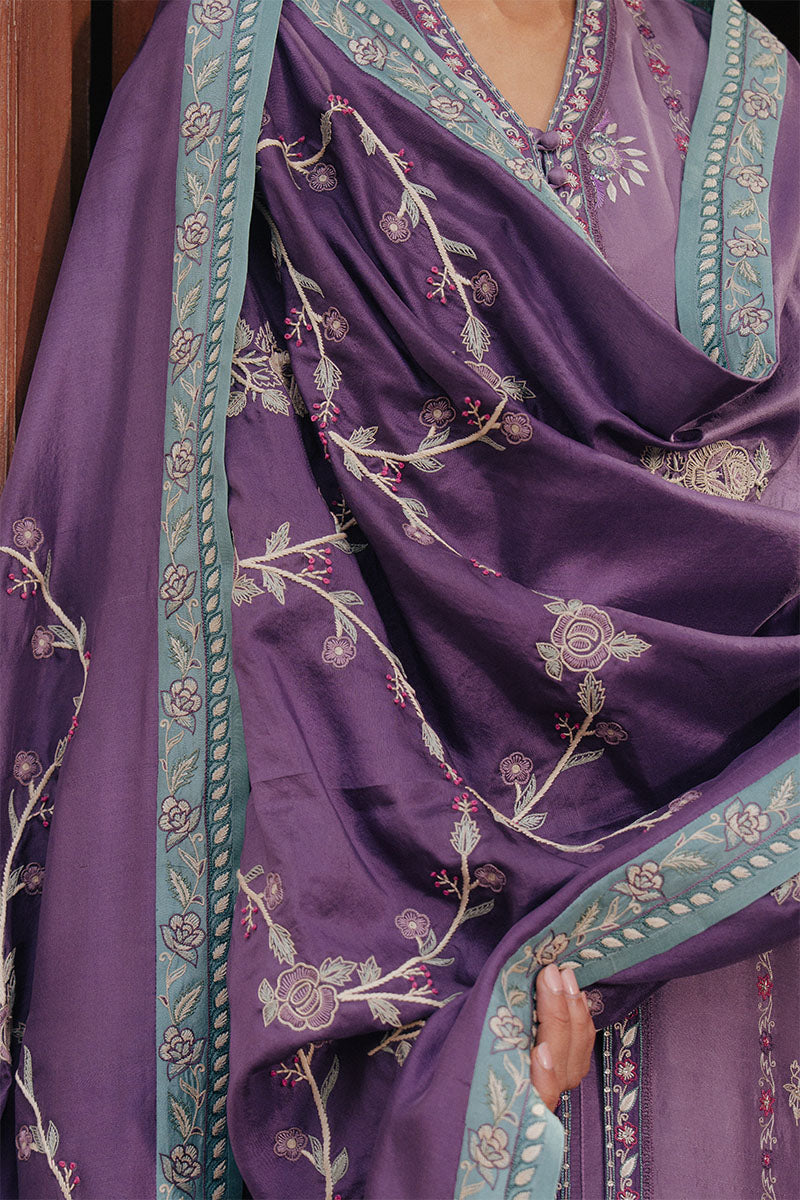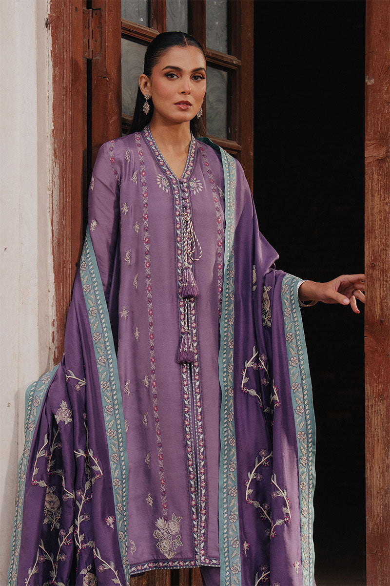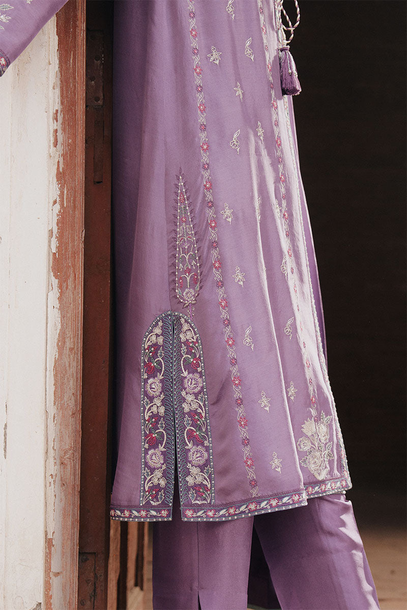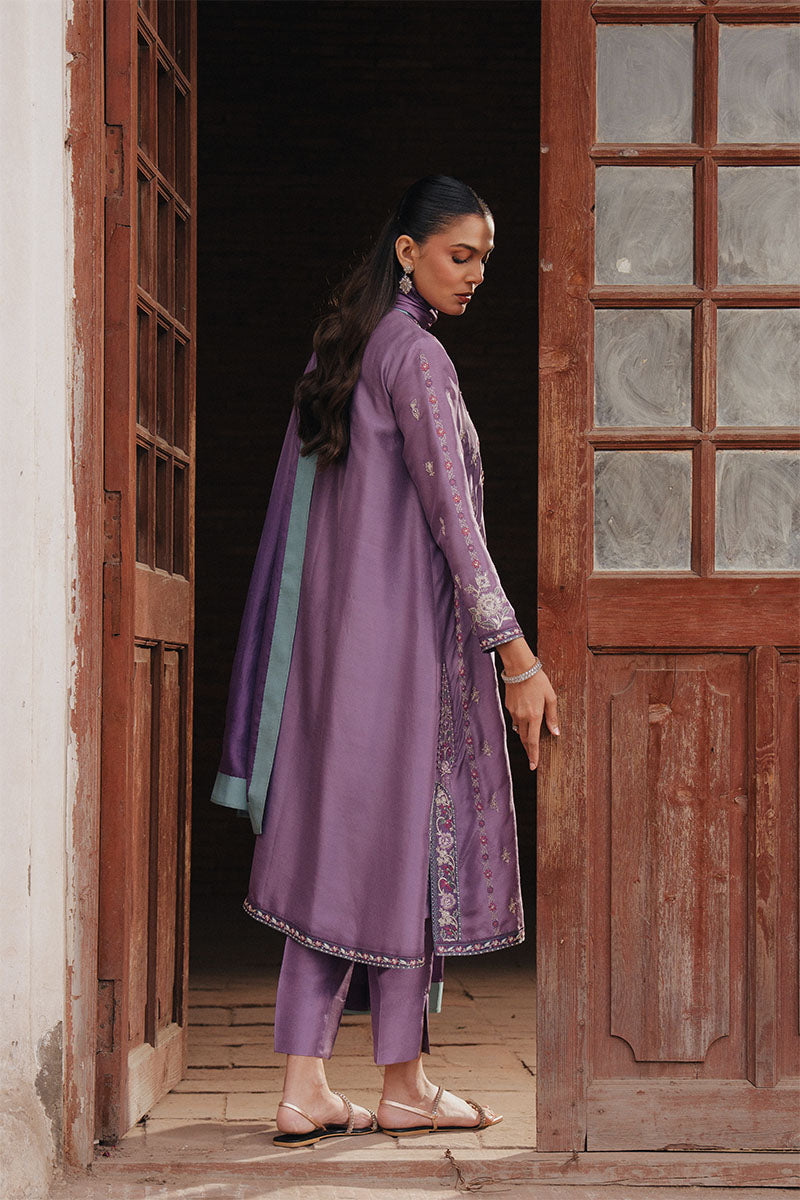 ANISA is rendered in a soft lilac mauve, gently deepened with layered mauve patching and finished with fine ivory embroidery. Delicate gulaab butis bloom across the surface, drawing from nature and the timeless elegance of Parsi gara craftsmanship. The embroidery adds quiet intricacy without overpowering the silhouette, allowing the palette to remain calm, graceful, and seasonless.