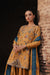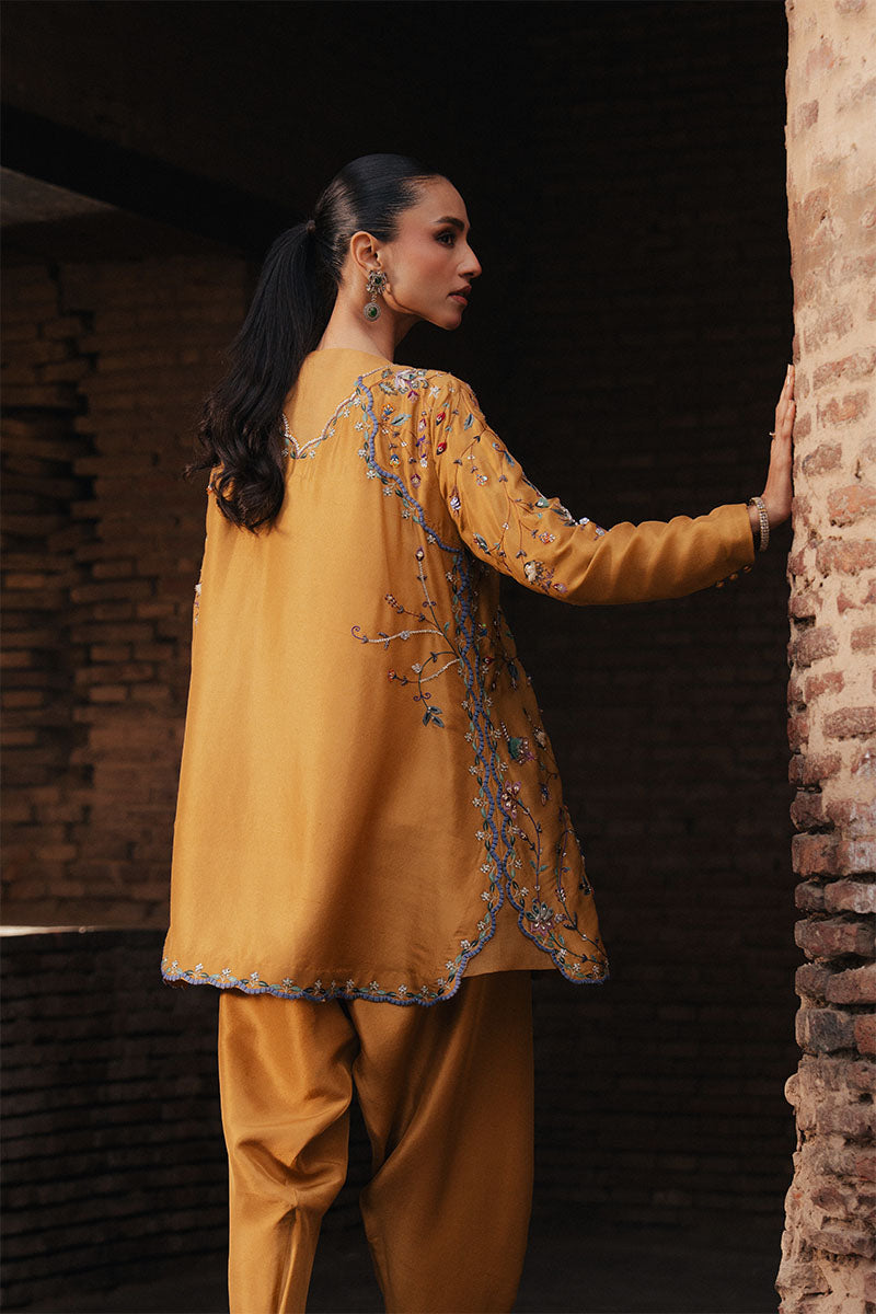 SAMAR is a mustard A-line top brought to life with lilac, violet, and teal embroideries arranged in an all-over floral trellis pattern. The silhouette feels playful yet balanced, offering ease and movement with a softly structured fall.