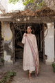 This captivating ensemble boasts a breath-taking Ombre from shades of lilac to blue crafted from ethereal tissue organza fabric, adorned with meticulous patchwork of organza with accent of blooming pinks. It is complemented by a separate slip/tube top and loose charmeuse pleated pant, adding a modern touch to this stunning attire.