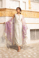 Ivory gold Jamawar short kurti, front with heavy mukesh diagonal lines. Front yoke is embroidered with hand resham butis while the sleeves are is in pure Raw Silk with hand resham butis with zari, gota, swarovski and mukesh work. This outfit comes with pure Raw Silk pants. The dupatta is in Tissue with gold foil printed banarsi style border which completes the look.