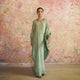 This katan patchwork short kurta comes with a box cut hemline and exquisite chirya and phool motifs in zardozi and reesham. It is adorned with deep emerald and turquoise accents on the neckline and hem with gota and zardozi embellishment. This article is paired with loose cut straight pants.