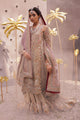 This ruby pink kallidaar bridal ensemble is a dream-worthy ode to all that is romantic and ethereal. Shades of antique gold sparkle through zardozi, sequin and crystal work. The brocade draped dupatta represents an era bygone with a complementing tangerine accent as its border. The heavily worked dupatta has Nizami bagh jaal embellished that completes the ensemble to perfection. Make a subtle statement in this ensemble that is perfect for an eventide celebration.