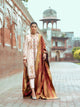 A regal long pure Silk Jamawar Angrakha cut shirt set in beautifully crafted traditional zardozi and hand threadwork. The intricate embroideries with traditional detailed edging add wonderfully to this shirt with accents of hot pink, peach and blues. It is complemented with a cut-work border. The look is completed with pure Raw Silk cigarette pants.