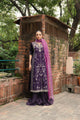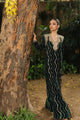 A modern kaftan silhouette with a soft rounded hemline, adorned with delicate embellishments around the neckline, front, and back. Accented with blue cuff details adding a pop of contrast to the deep velvet tone. Paired with raw silk pants featuring a rounded hem, this easy and breezy look is perfect for warm winter nights, intimate dinners, and pre-wedding shenaniigans.