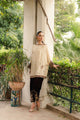 A chic off-shoulder velvet ensemble designed with youthful elegance. The shirt features delicate floral embroidery with butterfly accents, adding a touch of whimsy to the noir velvet base. Paired with loose pure silk jamawar pants, the look balances modernity with timeless charm. Perfect for light-hearted gatherings and foggy winter days, this outfit captures a sense of airiness and effortless grace.