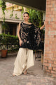 A jewel teal velvet ensemble, intricately adorned with antique gold detailing across the shirt. Delicate floral bunches in shades of pink and magenta protrude along the sides, adding depth and vibrance. Paired with a medium silk dupatta featuring a sitara wave border, this look embodies elegance — perfect for winter lunches and brunches.