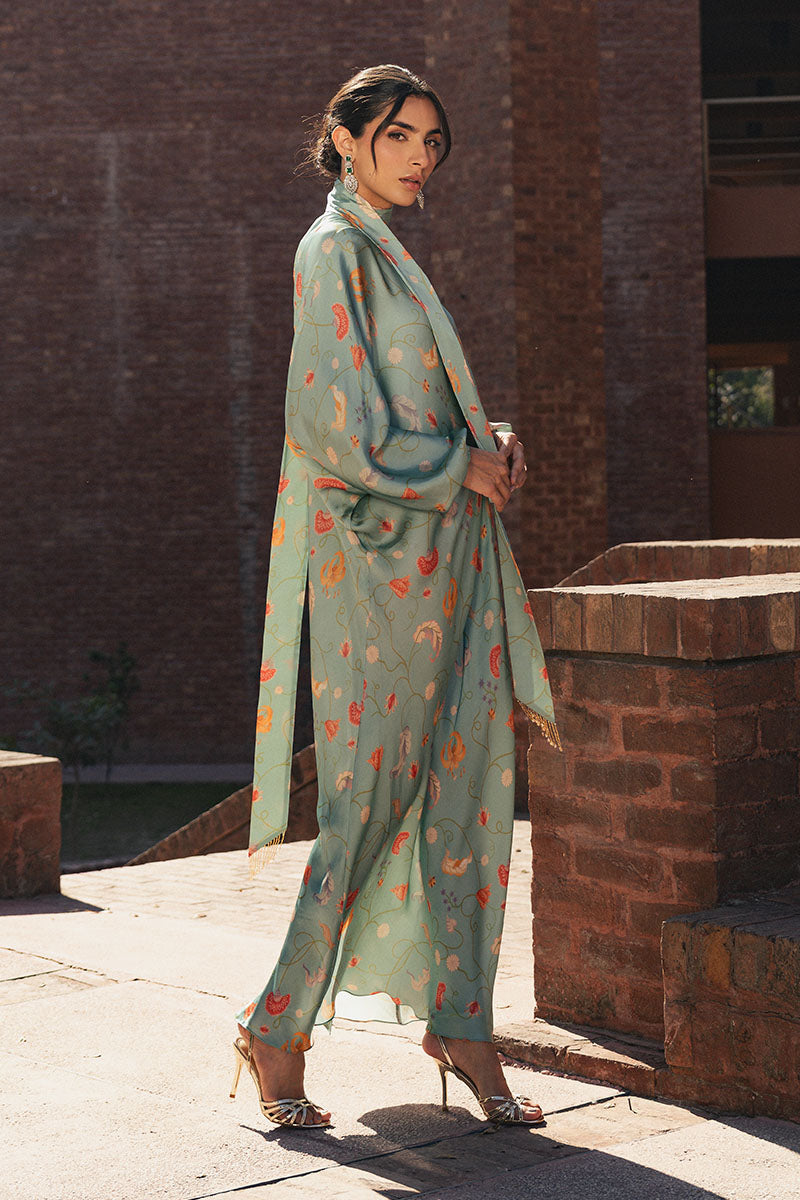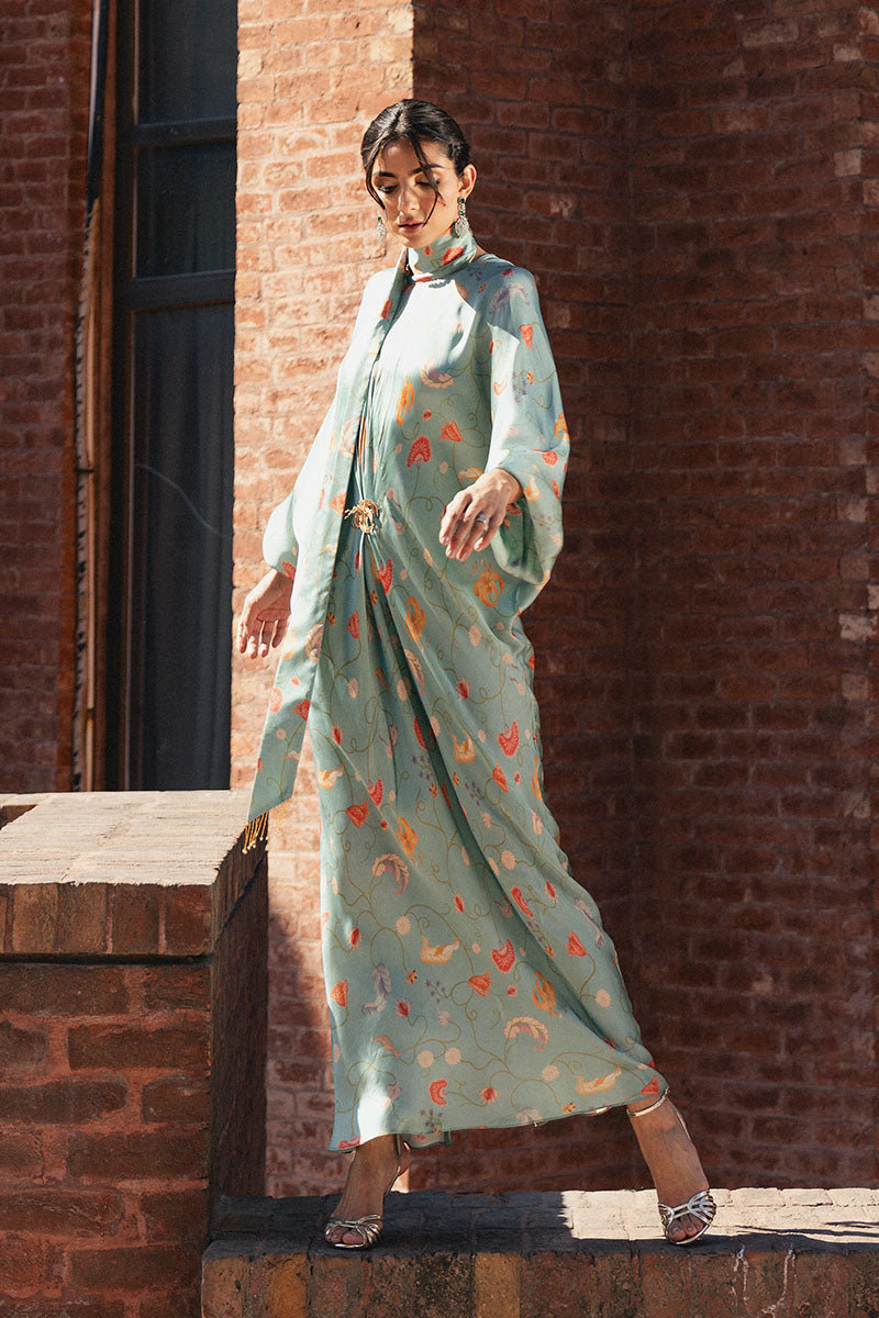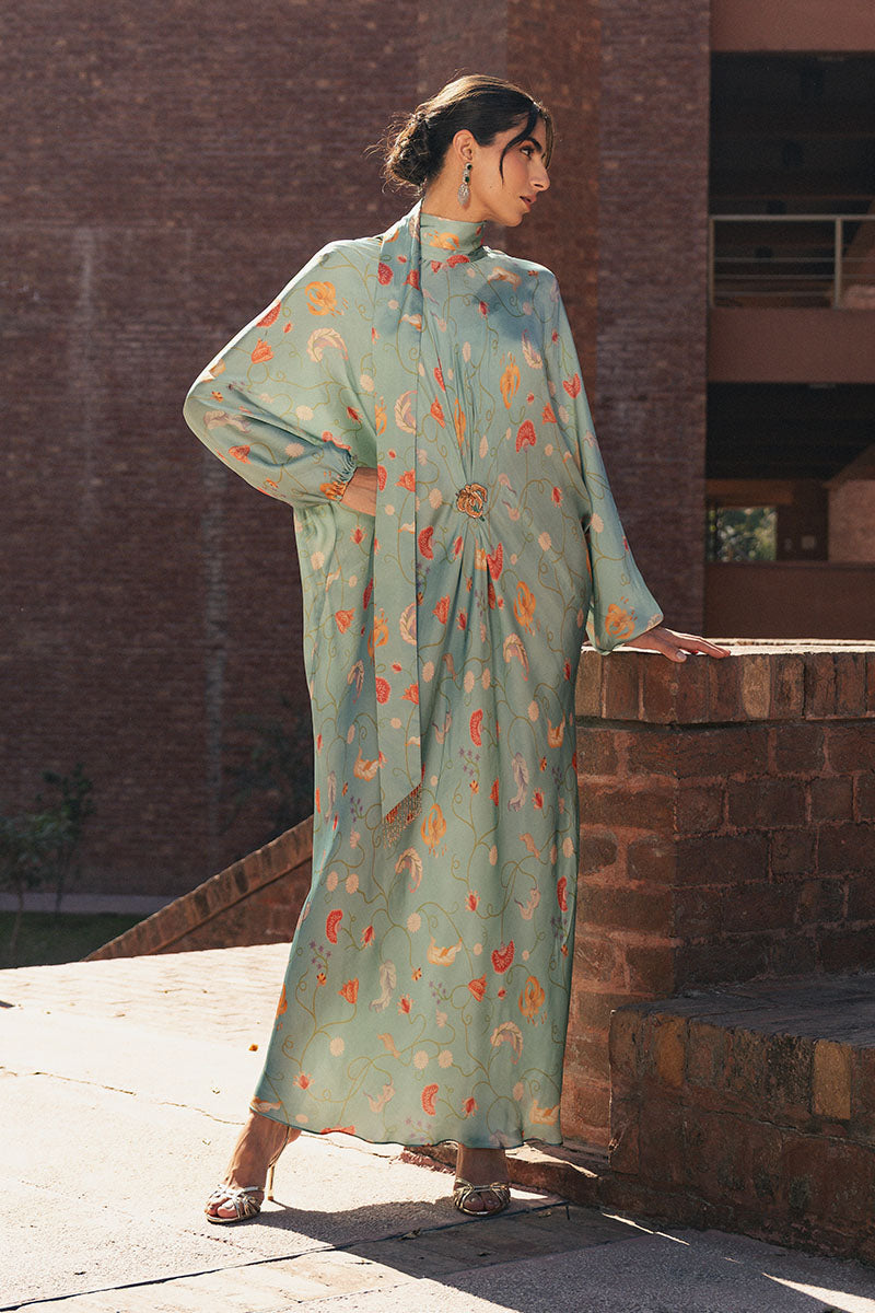 Loila is a fluid, flowy kaftan crafted in soft blended charmeuse, designed with an all-over floral drape that moves effortlessly with the body. The neckline is finished with a delicate tie detail, secured at the back, while a subtle floral-motif brooch accents the front. Light, graceful, and easy to wear, this piece is ideal for summer soirées and intimate gatherings.