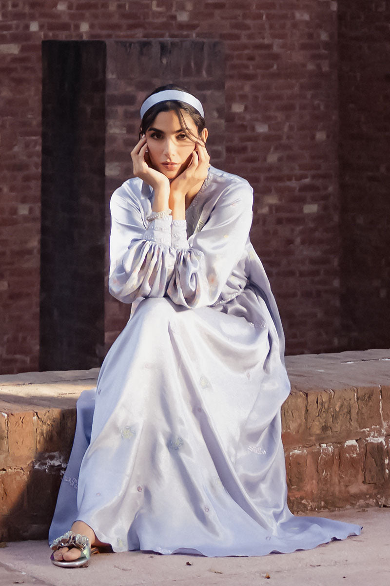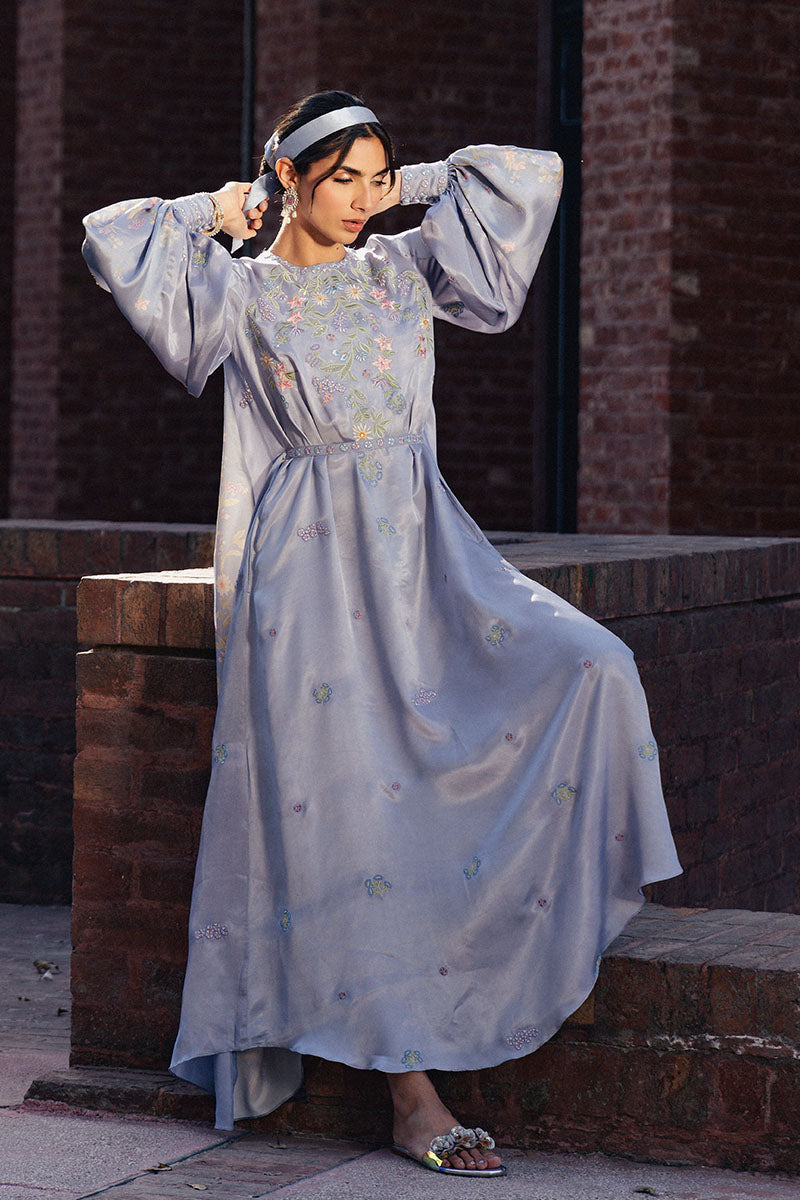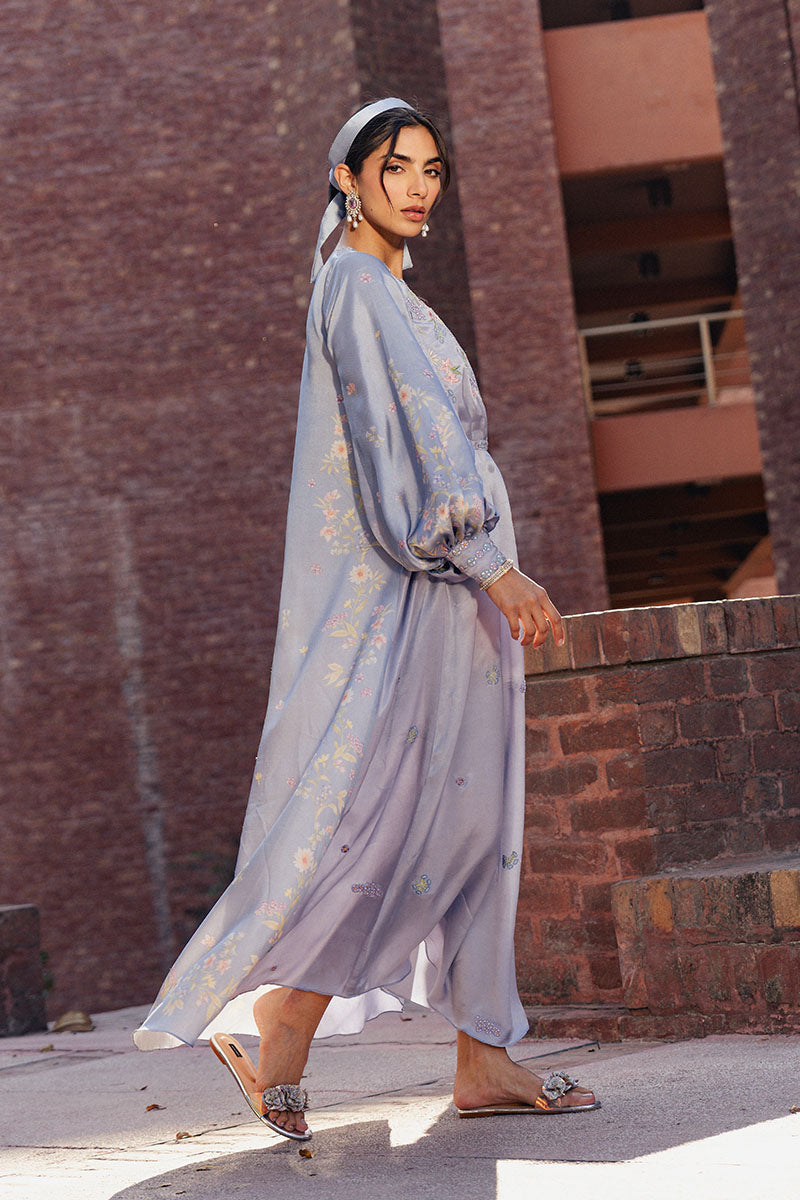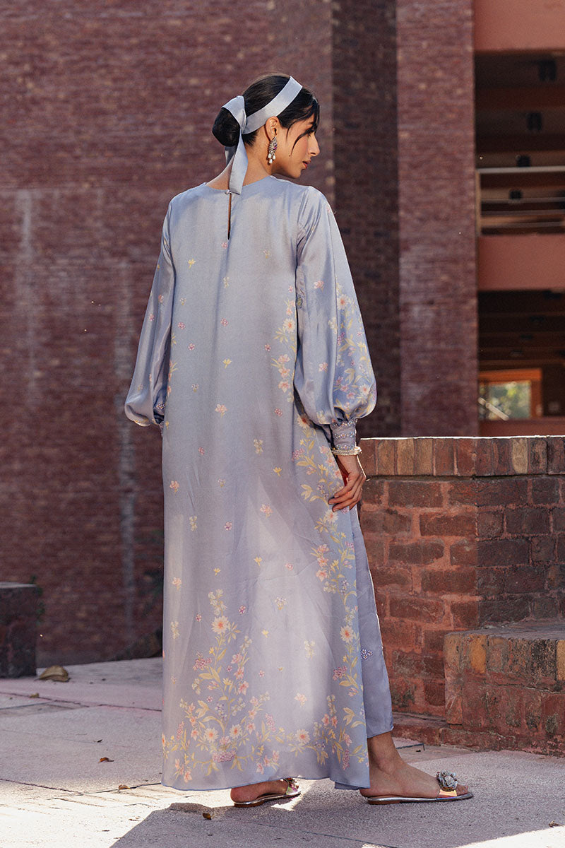 Sivan Printed Rod Silk Kaftan Dress features a long, straight, fluid silhouette designed for effortless wear. Crafted in printed rod silk, the piece is inspired by soft pastel English florals, bringing a fresh, summery feel to the design. Delicate floral embroidery at the neckline adds a subtle handcrafted detail, balancing ease with quiet elegance.