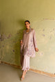 Rosha is a pastel paradise cut in multi coloured organza with a hand-embroidered neckline, front and back detailed in reesham, zardozi and mukesh work. It is paired with a pure raw silk slip with sequin detail and loose asymmetrical wavy pants. This delightfully detailed piece can easily translate from effortless glam to extravagance.