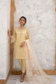 A blush pink Organza Pishwas exudes elegant sophistication draped gracefully around the body. The front is hand blocked printed. Neckline has zari work. This floor length Pishwas is finished with Crushed Tissue frill. It is paired with 2-tone printed dupatta.