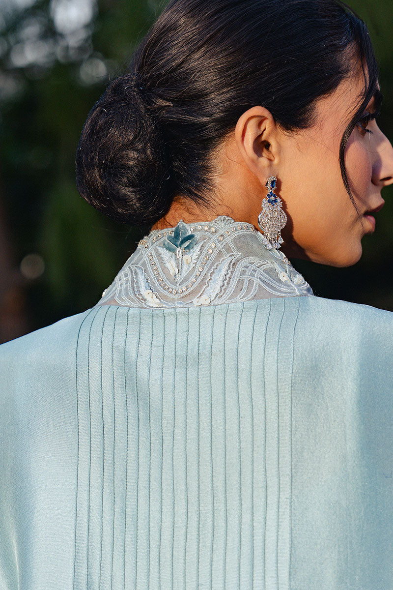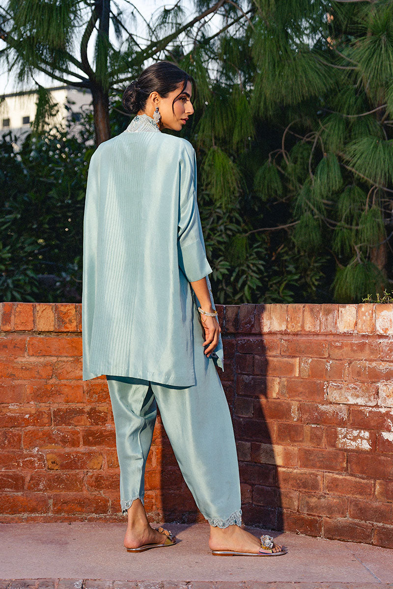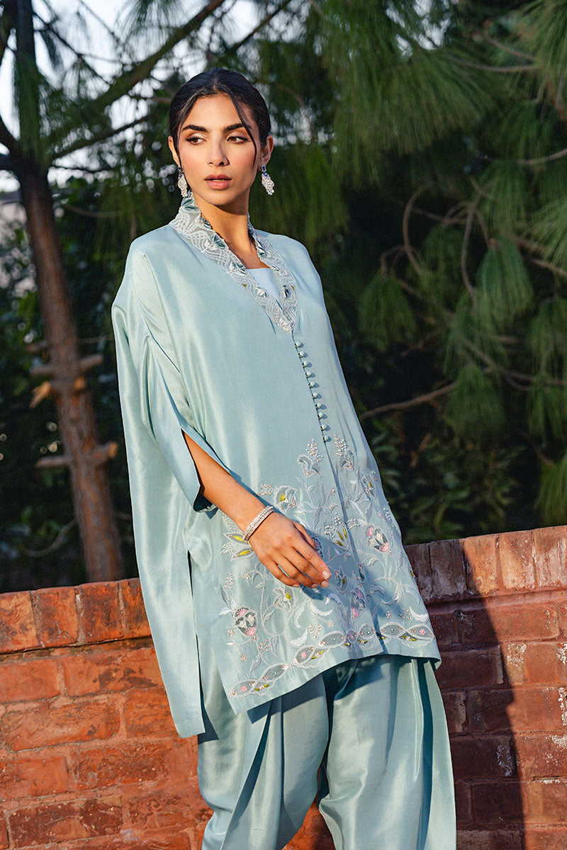 Laira is the perfect pastel tunic, cut from sumptuous Raw Silk with Organza patchwork. The relaxed silhouette has a collared neckline and is adorned with delicate hand-made floral motifs, pearls, sequins and hand embroidery. Pair yours with our matching embroidered detailed skinny Raw Silk shalwar.